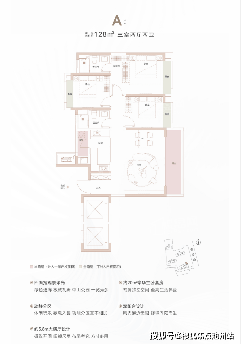 核心优势:独立衣帽间设计满足收纳需求,双套房配置提升私密性,客厅开间达6.8米,适合家庭聚会。