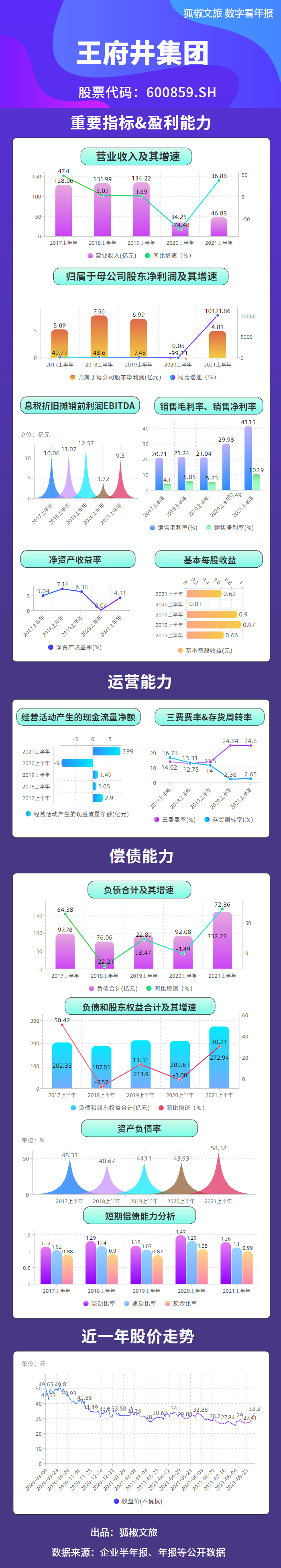 偿债能力方面,2017年至2021年同期,王府井负债合计分别为97.78亿元、76.06亿元、93.47亿元、92.08亿元和332.22亿元。本报告期内,王府井负债合计为5年同期较高,资产负债率达58.32%,短期偿债能力趋于正常。