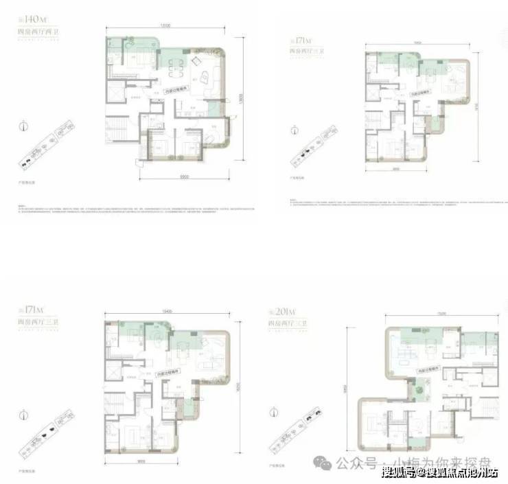 该项目的外立面,是公建化外立面,做了香槟金色的弧形线条,采用了大全景玻璃,颜值也是很高。从效果图来看,预计是封窗交付。该项目小梅了解到该户型面积段主要包含3个,140㎡、171㎡以及201㎡左右,其中主力户型是170㎡左右。户型图如下