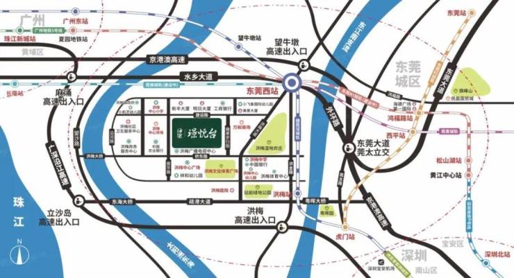 海德璟悦台离粤港澳大湾区的轨道交通枢纽——东莞西站约2km,坐拥3城轨1地铁,享东莞西站、洪梅站双站点,形成东莞TOD几何中心,与广佛深惠形成半小时交通圈。