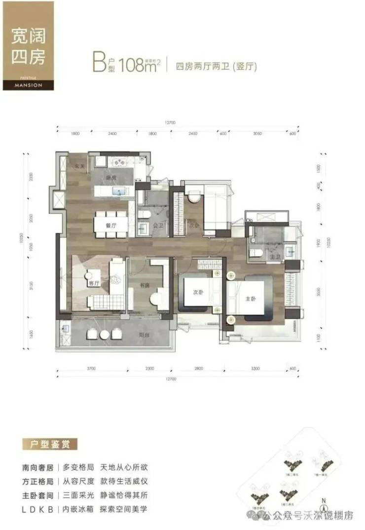 阅臻府约108-114㎡B户型以方正格局极致利用每一寸空间,将客厅、主卧、次卧等核心起居空间朝南布置,实现四开间南向瞰海的温暖舒适。
