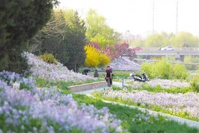 4月12日,凉水河两岸盛开二月兰,市民在河边骑行游玩。 新京报记者 王飞 摄