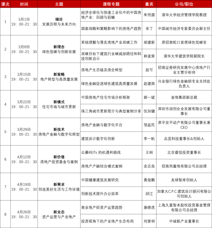 2022年春季课程从3月1日至4月26日,由清华大学深圳国际研究生院发起,深圳清华校友房地产协会负责全程统筹,搜狐焦点研究院参与课后课程内容整理及推送。