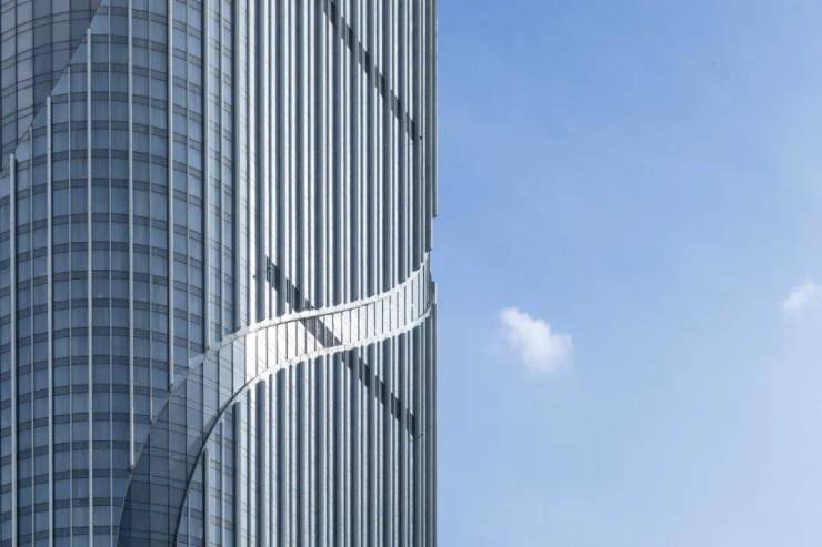 配套副楼作为商业及社区服务场所,横向的表皮处理仿佛是延绵起伏的江面,为市民提供了一个宜人通透的界面。屋顶平台的线条进一步向外延伸,将建筑与景观融为一体。具有艺术性的雨篷衔接双塔底层,为市民创造一个良好的步行体验。