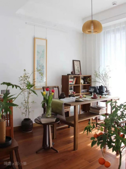 茶桌两端放上矮凳,放上植物与书籍,方便阅读,也让空间瞬间又了灵动气息。