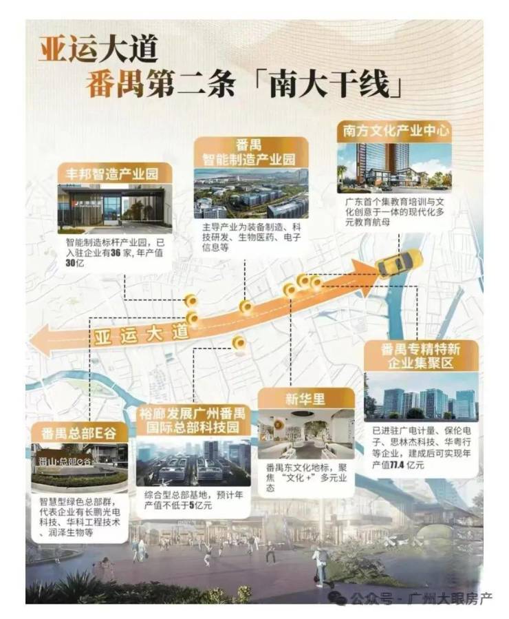 值得注意的是,以番禺广场商圈为起点,连通到莲花湾汽车产业带,“第二条南大干线”千亿产业轴已在酝酿。亚运大道沿线,密布番禺总部E谷、智能制造产业园、丰邦智造产业园等节点,这里将是番禺的“智核”所在,也是番禺未来所在。