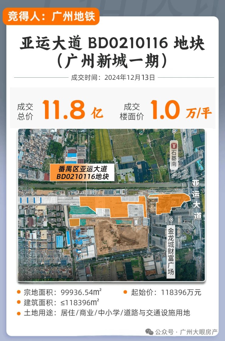 去年12月,广州新城停车场一期地块(亚运大道BD0210116地块)被广州地铁地产以底价118396万元拿下,楼面价约为1万/平(未扣除配建)。