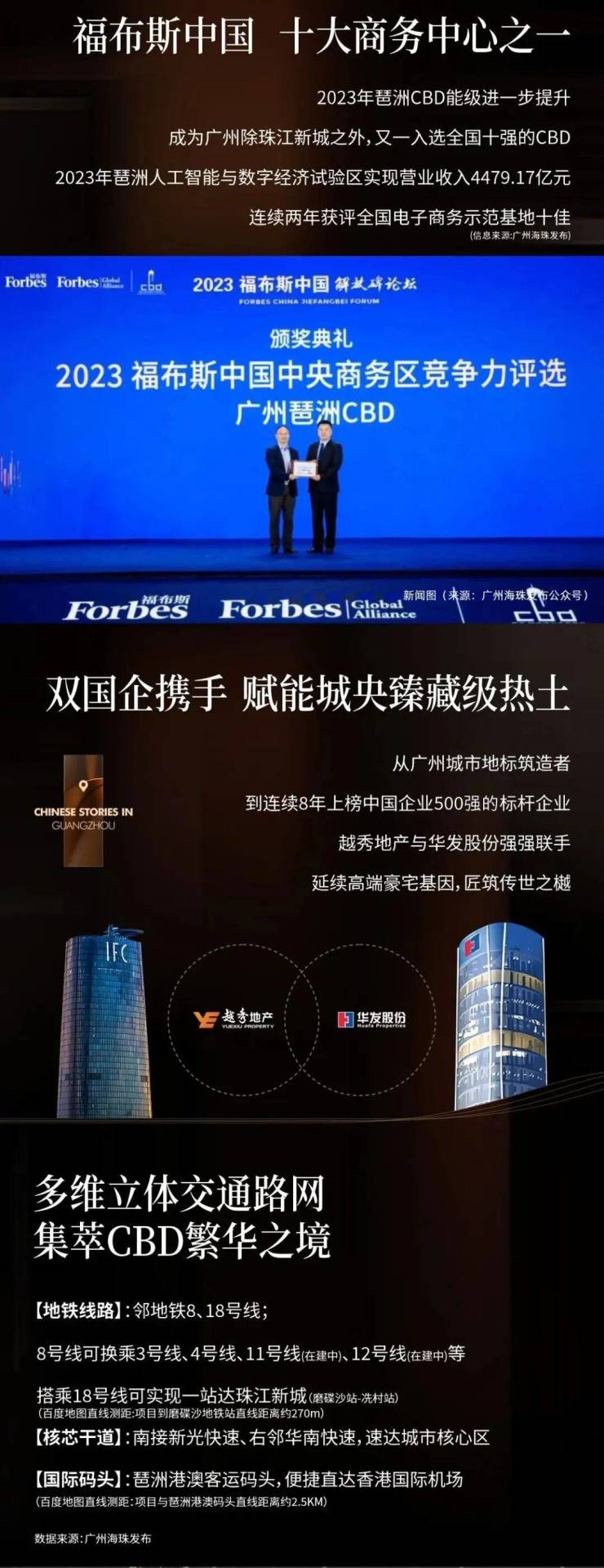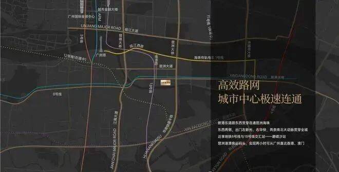 - 5维立体路网:8条地铁(含在建)、2条城轨(广佛环线、穗深城际)、琶洲港澳码头(150分钟直达香港机场)。