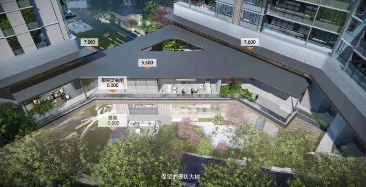 规划预留10米高的高架空空间以及下沉花园,结合大树打造生态自然的人文场所。