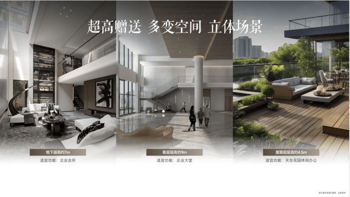 超高赠送、多变空间,酒店式独立专梯首层约9米层高大堂,尽显尊崇企业风范负一层约7米层高专属空间,电梯直达,可自由改造艺术展厅、阶梯路演等约4.5米天台花园,具备顶层酒会、宴会沙龙、户外泡池等多元需求