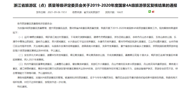 9月6日,浙江省文化和旅游厅发布了浙江省旅游区(点)质量等级评定委员会关于2019-2020年度国家4A级旅游景区复核结果的通报,通报显示,21家旅游景区复核达到4A标准,予以通过。7家景区申请延期复核,纳入2021年度复核。9家景区复核未达到4A标准,予以通报批评。
