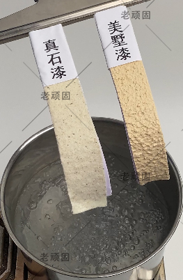 老顽固美墅漆通过两个小实验验证了自身超强的耐候性。例如在100℃的沸水中蒸煮,模拟长期日晒雨淋的效果,这个实验中美墅漆的涂膜牢固附着在基层上,而与之相比传统的真石漆则已经被泡胀,脱离基层了;将美墅漆涂膜放置在紫外线老化箱,模拟阳光中的紫外线对涂料的老化作用。经过2000小时的紫外线照射,美墅漆没有出现任何黄变,颜色依旧亮丽如新。