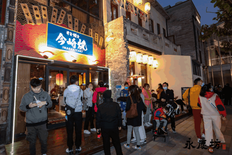 2018年,永庆坊二期启动,改造面积相当于一期的10倍,这也让永庆坊有了更大的发挥空间。全新进驻的书店、人气餐饮、酒吧等业态,与一期形成差异互补,让永庆坊的游逛模式由之前的“朝叹”转变为“朝叹晚蒲”,商业氛围的改变随之而来:越来越多人逛永庆坊,与此同时,人们在永庆坊停留的时间也在延长。