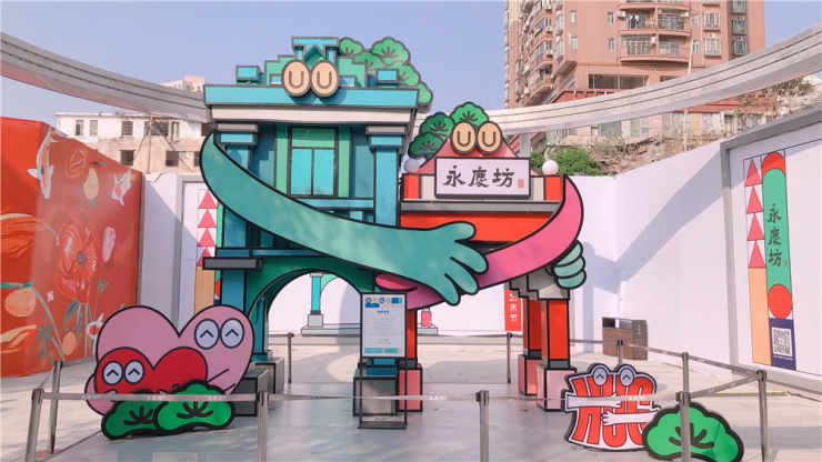 2020年岁末,永庆坊邀请本土90后青年艺术家谢凸,结合永庆坊地缘特色——骑楼建筑,融入谢凸标志性的“松松”元素,创作“拥抱骑楼”主题美陈。
