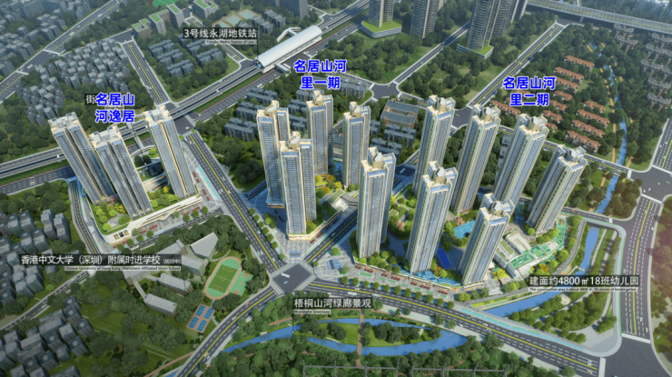 项目总建面约48万平的纯居大城,外享紧邻长约2.4公里的梧桐山河碧道,环山亲水,串联街心公园与滨河绿廊,将都市融入自然,为业主带来享受惬意的慢生活的场所。