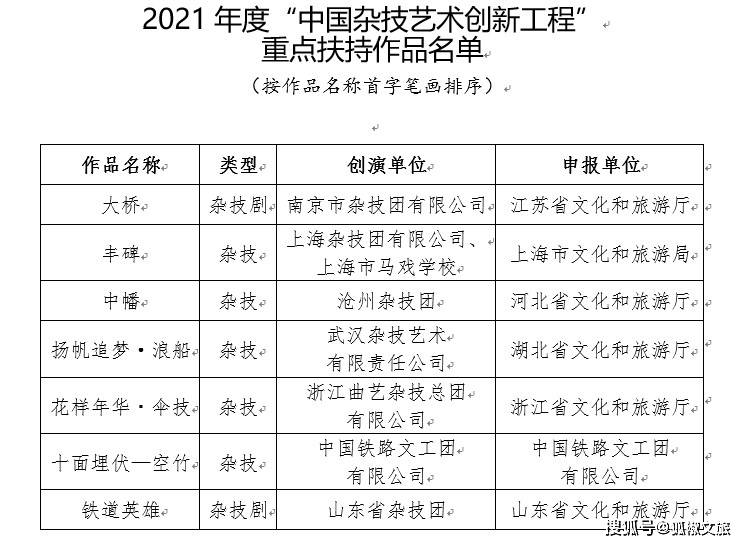 近日文旅部艺术司发布2021年度“中国杂技艺术创新工程”重点扶持作品的遴选结果,具体公文如下: