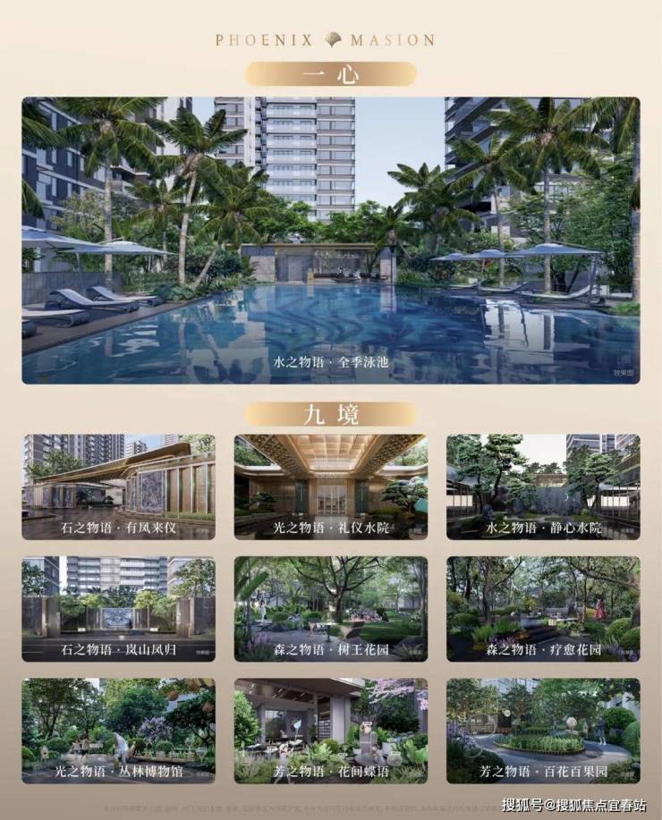 以全季泳池为核心,匠造“一心九境”园林空间,涵盖树王花园、疗愈花园、丛林博物馆、花间蝶语、百花百果园等