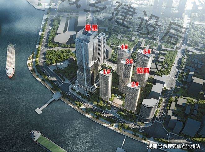 招商地块,一共5栋住宅,住宅高度42-45F,首层全架空,大概有588户,户均221m²。从效果图来看,流线型玻璃幕墙立面,大概率有270°转角观景窗,大门约52米宽,高层4F,4F配套会所看江泳池等,入户后就是户外的下沉庭院等,案名大概率是【招商长江序】,招商地块东南朝向,一线临长江,1、2号楼在第一排,看江无遮挡,对面为积玉桥。3号楼位于第二排,左右侧面还是会收到一定的视野遮挡,三排4、5号楼估计就是夹缝看江了。