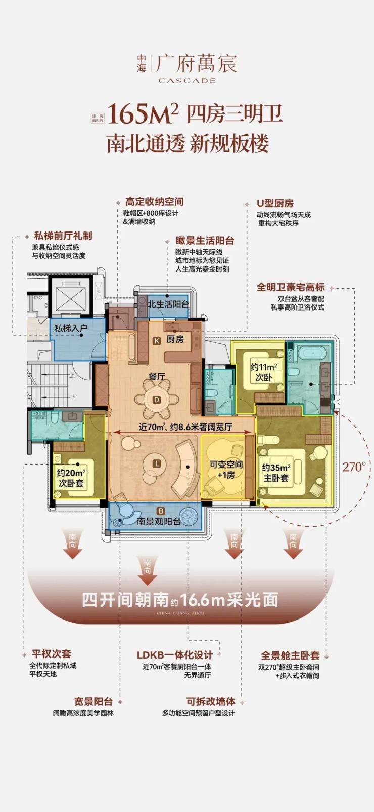 全盘有3栋楼,一共就6个踢腿,均为25~29层纯南向板楼,全部采用2T2设计,专梯专户的归家动线,每一户都拥有私享的入户厅。主打165㎡四房双主套,总共154套。