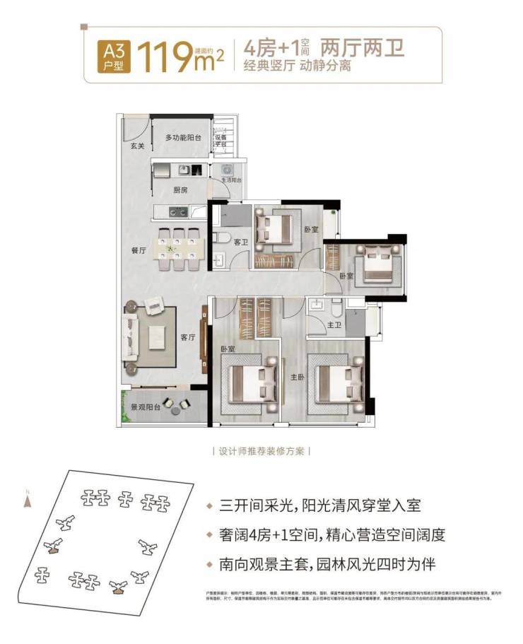 建面约119㎡的4房+1空间,以竖厅为核心,约10米南向三开间,南向奢阔主套,配步入式衣帽间,动静分区互不干扰。