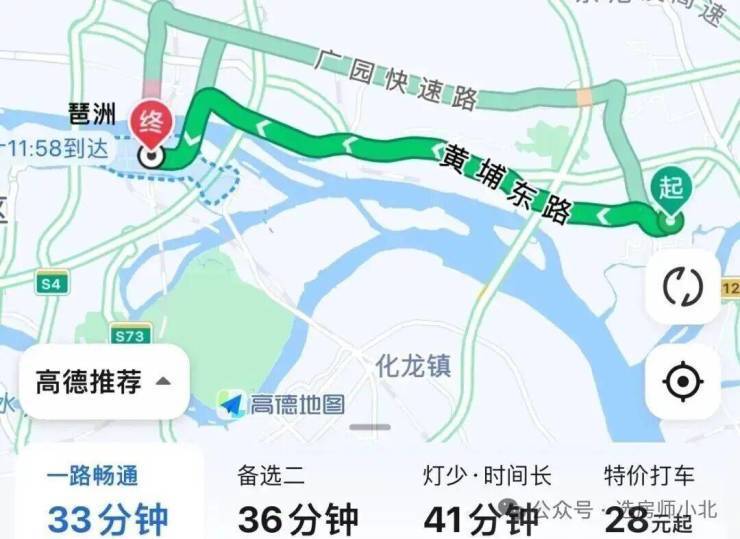 到珠江新城:出小区走黄埔东路转黄埔大道,全程24公里,不堵车情况下耗时42分钟左右。