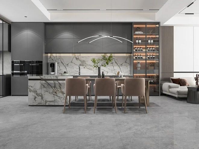 源自伊朗的天然石材,是德国玫瑰宫建筑所用石材,且赋予其细腻且深邃的灰色,柔和的灰色调给了空间更多的儒雅与高级感,庄重中透露着强烈的个性。