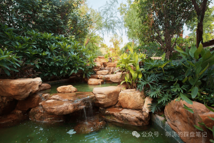 重金工法造园,采用黄蜡石打造园林水景,错落有致,移步换景。甄选全冠移植香樟树、约300年十八学士白茶花、非洲加拿列海枣树和多种季节性水果树,点缀四时山色,尽享四季盛景。
