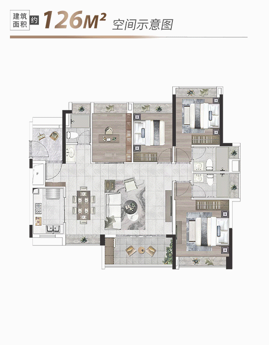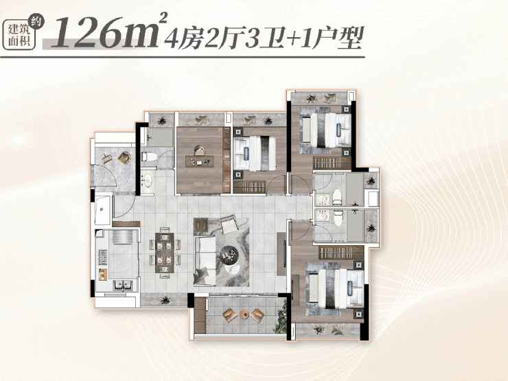 譬如这个约126平的户型能做到4房3卫2厅+1空间,得房率不输新规房。