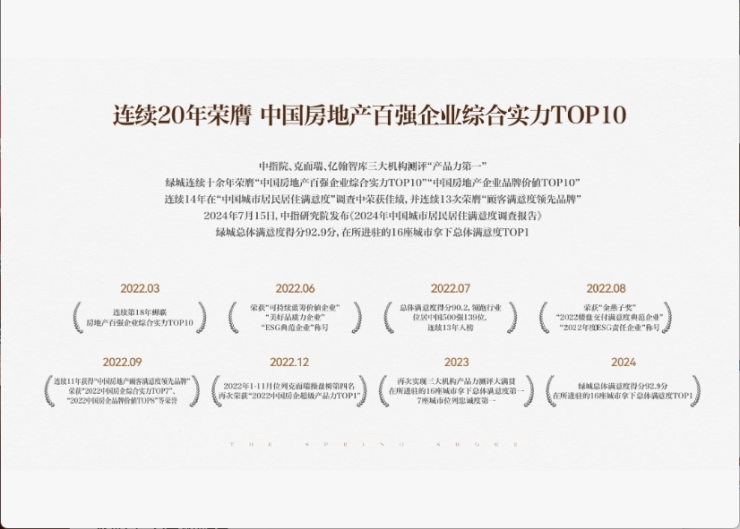 绿城历经30年的发展,绿城中国总资产规模超 5300 亿元,净资产规模超 1000 亿元,“绿城”品牌价值 1188 亿元,并连续20年荣膺“中国房地产百强企业综合实力TOP10”,绿城始终坚持对理想生活的追求,营造美丽建筑,创造美好生活。(信息来源:绿城官方,数据截至2025年1月)