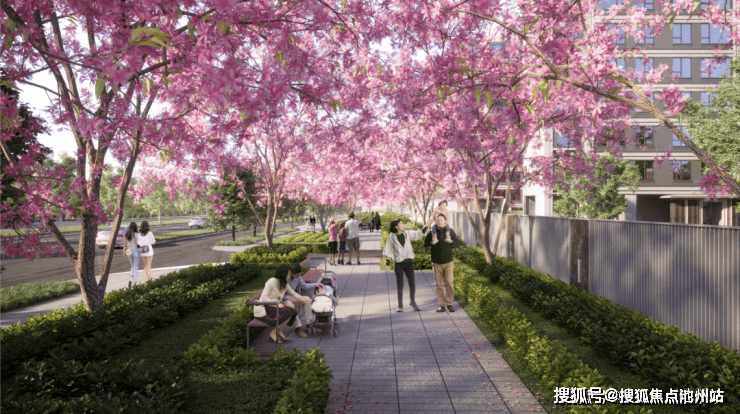 ·围绕外侧乐荟街,在市政绿化基础上进行进阶迭代,通过层级错落的绿化丰富转角景观,种植百棵樱花树打造绿色优质生态步道围合小区,伴随阵阵微风,打造金华都会下的活力森居生活。