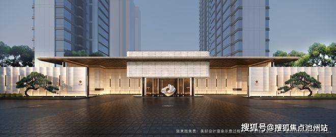 地面铺装石材带着独特纹理,行走其中,好似波纹渐起。两株名贵造型罗汉松分列左右,如同优雅的迎宾使者,以苍翠之姿邀您入内。