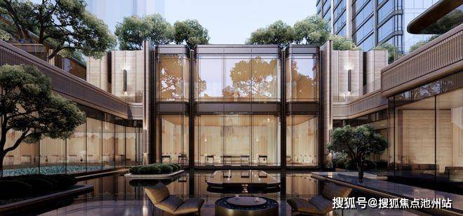 江屿镜庭以“江中有岛、岛中有湖”的江心屿为设计灵感,整个景观以温州首个单侧悬挑风雨连廊串通,透光云石、乱纹古铜金铝板在光影交织中勾勒出空间的奢华质感与匠心精神。