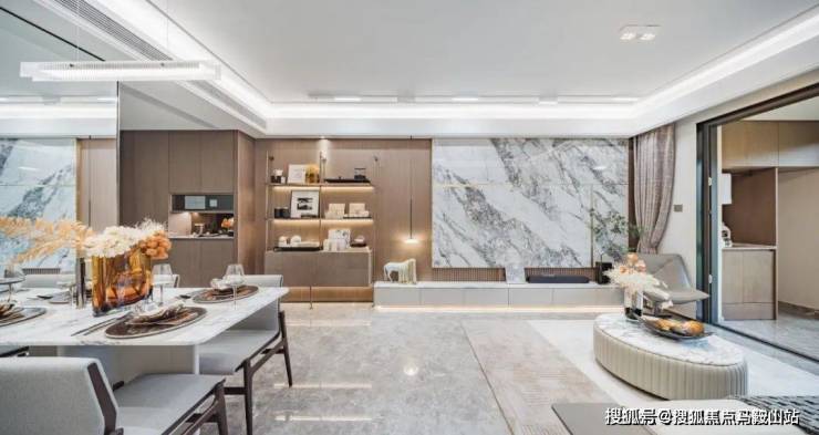 精选钢木复合门、臻选雅艺壁布、自然木饰面、全景一体化岩板背景墙等精奢材质,搭配充满仪式感的氛围灯带、打磨移门、踢脚线、过门石等每一处细节。