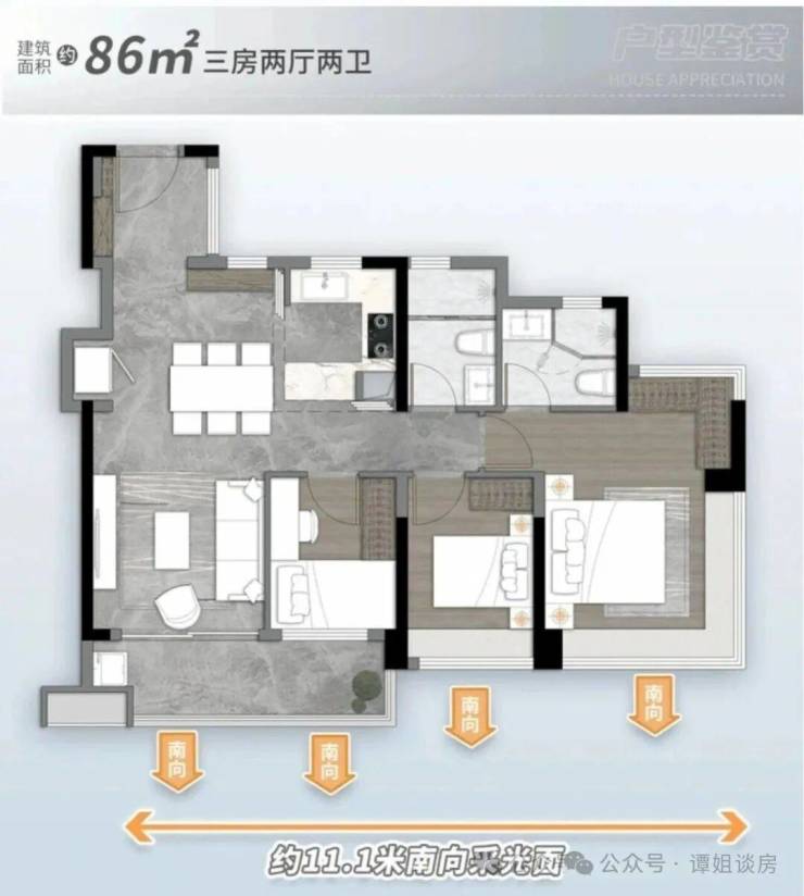 86㎡三空间两卫,三口之家一步到位,一期断货王PLUS 南向4开间 约11.1m采光,双进私密玄关 5.4m跑道式阳台,主卧270°无立柱景观飘窗 阳光衣帽间 。