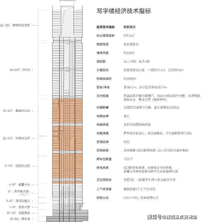 项目共80层,分别布局约8.9万㎡高端商业Mall超深活中心(B2-4F)、约9万㎡超甲级写字楼(5-43F)、约6万㎡ SIC65 办公商务会馆(44-64F)、约3.8万㎡香格里拉酒店(65-78F)四大场域,共同构筑人类在密度建设区域内的垂直空间想象