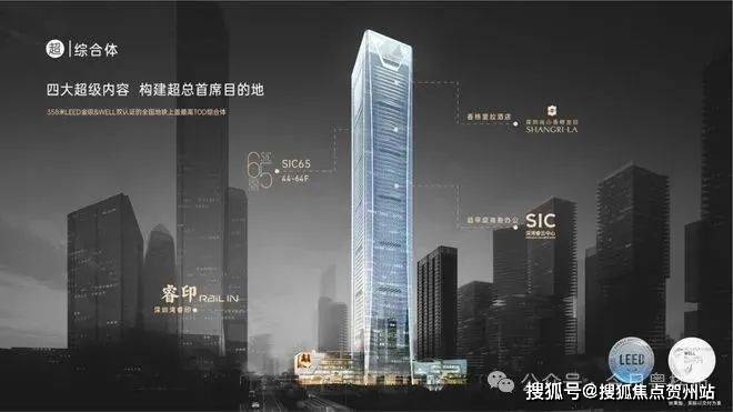 项目位于位于南山区,高达358米,共80层,分别布局高端商业Mall超深活中心、超甲级写字楼、SIC65办公商务会馆、香格里拉酒店四大场域,是深超总首个350m+超高层综合体。