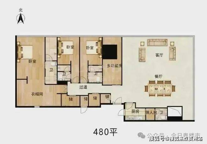 480平3+1房 3+1房(三套房)客厅105平,主卧65平奢阔设计。