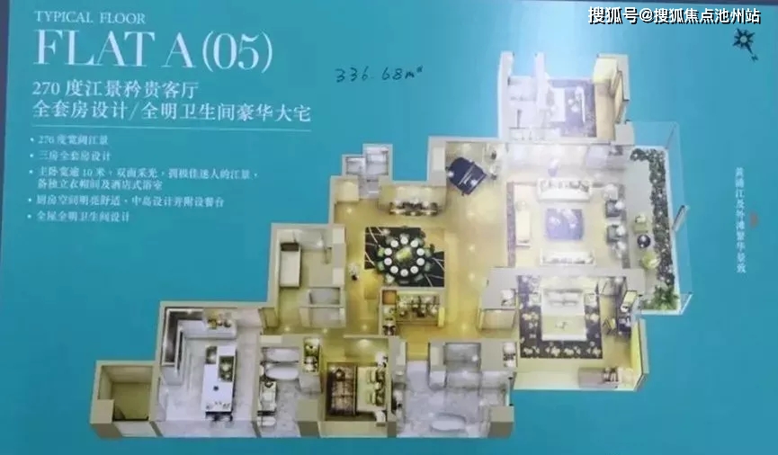 E户型336平米(4000W-6000W)(南北通精致3套房)+书房+保姆间,1房朝南,两房朝北,全套房设计,厅朝西带超大阳台,270°无敌江景。