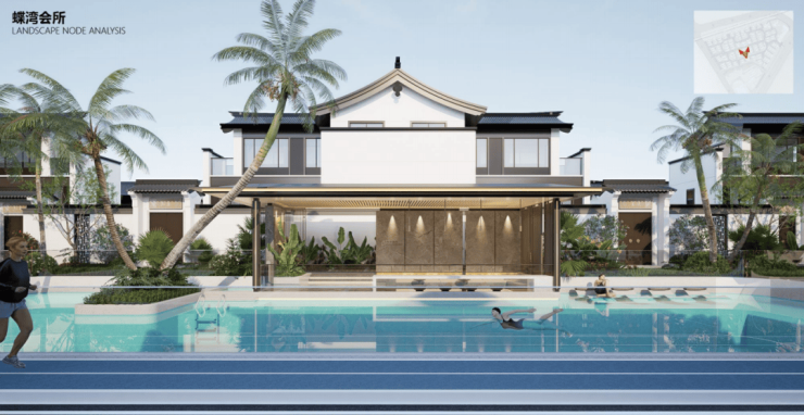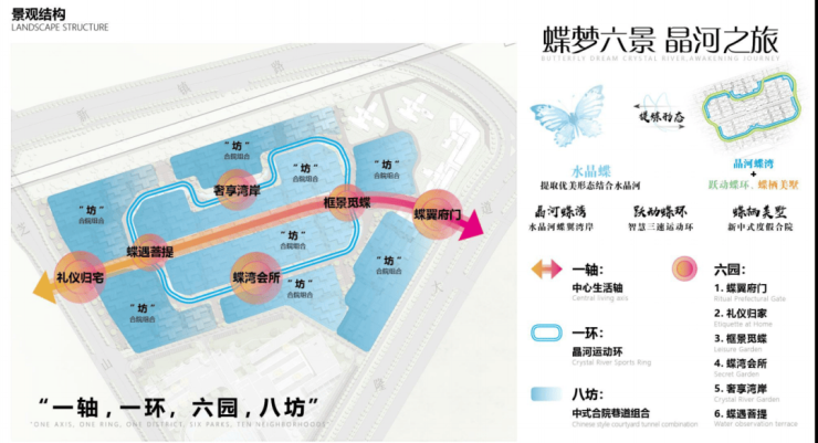 ——以“一轴”“一环”“六园”“八坊”为设计核心,打造中式园林,景观层层递进,营造出“蝶梦六景,晶河之旅”的归家体验。
