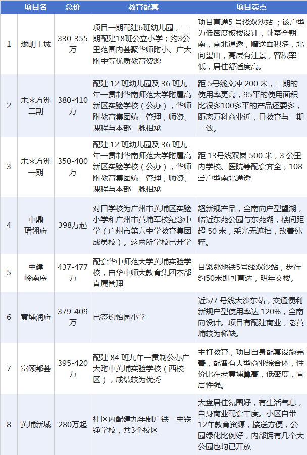 交通方面,地铁是多数项目的核心优势。广州地铁珑岄上城5 号线双沙站地铁入户,通勤天河等核心区十分便捷;未来方洲双期分别临近 13 号线双岗站和 5 号线文冲站,双地铁加持提升出行灵活性;中建岭南序步行可达 13 号线南海神庙站;华润置地黄埔润府靠近大沙东地铁站;仅万科黄埔新城和富颐华庭距地铁稍远,前者步行到地铁站约 1 公里,后者到鱼珠站 1.8 公里,更适合自驾人群,其中富颐华庭自驾到天河城百货、山姆等商圈十分便捷。教育配套上,多个项目自带优质学位。未来方洲和中建岭南序均配套九年制华师附学位;中鼎三期珺翎府坐拥黄埔实验小学 + 六中的成熟学位组合;华润置地黄埔润府签约怡园小学;富颐华庭家门口就是 84 个班的黄广附西校区;万科黄埔新城配套九年制铁铮学校,能全方位满足家长的学位刚需。商业配套上,社区自建商业与周边成熟商圈形成互补。广州地铁珑岄上城的 8000 方社区商业,可满足业主日常购物需求;富颐华庭自建 24 万方商业,还能共享天河商圈资源;其余项目也多依托旧改规划的商业配套,未来生活便利性可期。