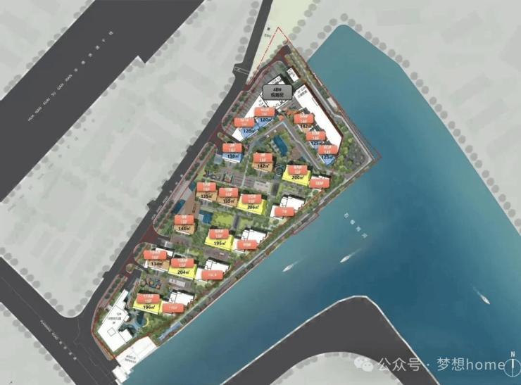 产品主要以小高层和叠墅为主,其中16栋为14-16层的小高层住宅,5栋临河的4层叠墅。由于临近军区的原因,所以朝向不是正南,而是偏西南,小区设计南低北高,东侧的临河位置由于限高15米,做了5栋4层高叠墅,西侧也是小高层15-16层设计。