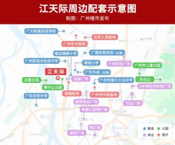 白云广雅实验学校、广大附属实验学校、第65中学(省一级)、槎龙镇泰小学(区一级)、松洲槎龙九年一贯制学校(在建中),项目自身配套幼儿园和少年宫