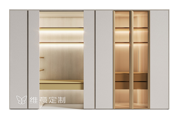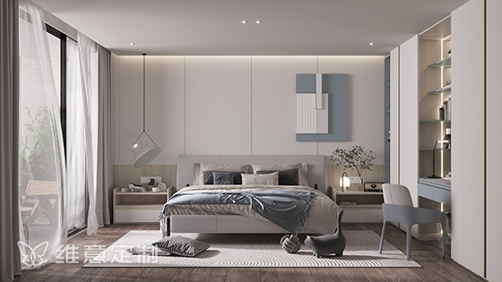灰蓝低饱色调,将宁静与柔和代入卧房空间,肤感布纹衣柜与灰蓝区域融合。