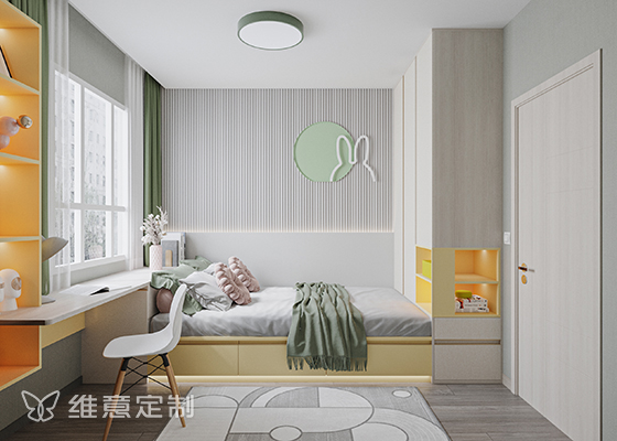 一体化榻榻米定制床,兼顾学习、储物、展示功能,全部柜体靠墙,留出极大的玩耍活动空间,释放孩子的爱玩天性。