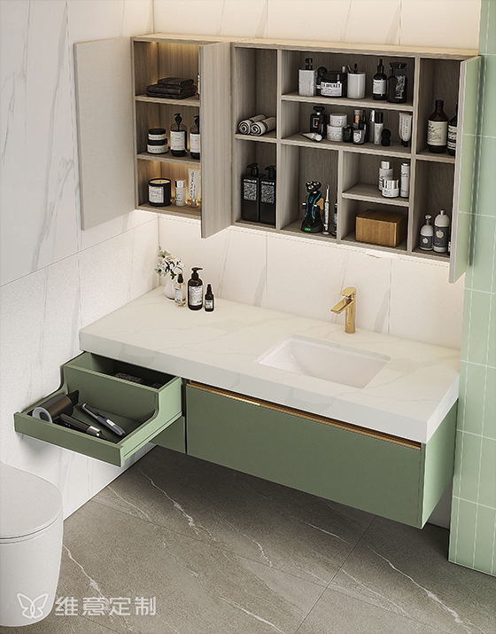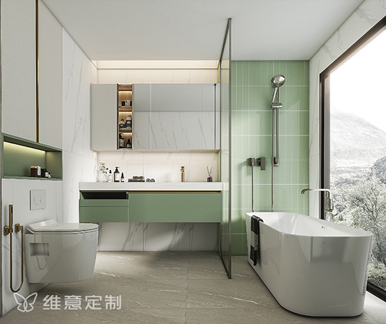 自然清新的绿邂逅白墙,躺在浴缸犹如在森林里徜徉。悬挂式卫浴柜,入墙的半高柜,独立小尺寸浴缸不会太占地,小空间也能享受越级的沐浴享受。