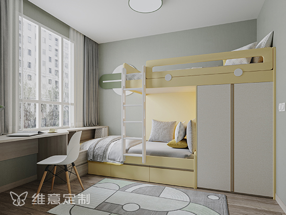 错位镂空定制上下床,光线更通透,二孩也能拥有各自隐私空间,与书桌巧妙链接,兼具学习、储物、睡眠功能。