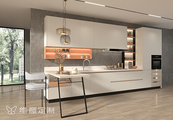 杏叶橙,一抹加入点亮了厨房。米白门板与金丝勾线的碰撞,也突出北欧轻奢的个性。
