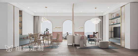但光有色彩还不够,维意定制将其创新与北欧轻奢风格相结合,加入金色金属的点缀,再配以时尚趣味性的软装搭配,整体打造出清新,时尚,精致的北欧ins轻奢空间,致力给都市生活的年轻人更舒适的生活体验和情感寄托。