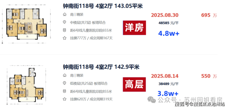 从二手房交易数据来看,洋房挂牌价普遍比高层要高,换手率与溢价率均显著高于高层产品。
