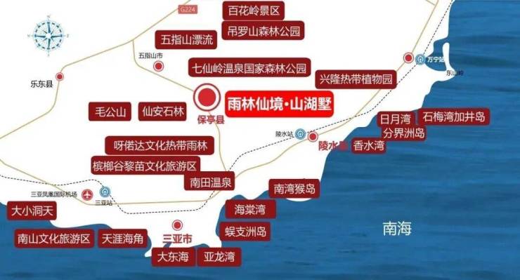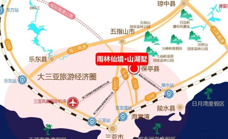项目地处保亭,大三亚1小时生活经济圈内;距凤凰机场直线距离约45公里,三亚高铁站直线距离约为40公里,陵水高铁站直线距离约为30公里,50分钟左右可到达;30分钟车程可到达国家海岸《海棠湾旅游度假区》,《解放军301医院》,50分钟左右到达三亚市行政中心区;20分钟车程可到达保亭著名《七仙岭温泉国家森林公园》、《呀诺达雨林文化旅游区》;40分钟到达《海南槟榔谷黎苗文化旅游区》;50分钟可到三亚《天涯海角游览区》、《南山文化旅游区》及《蜈支洲岛旅游区》;30分钟可达陵水的《黎安国际教育创新试验区》自贸港建设必不可少的《海南大学城》;